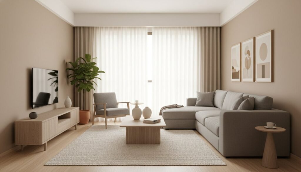 - A neutral color palette with depth: The palette relies on layered shades of cream, beige, grey, and taupe to create a calm yet complex backdrop.