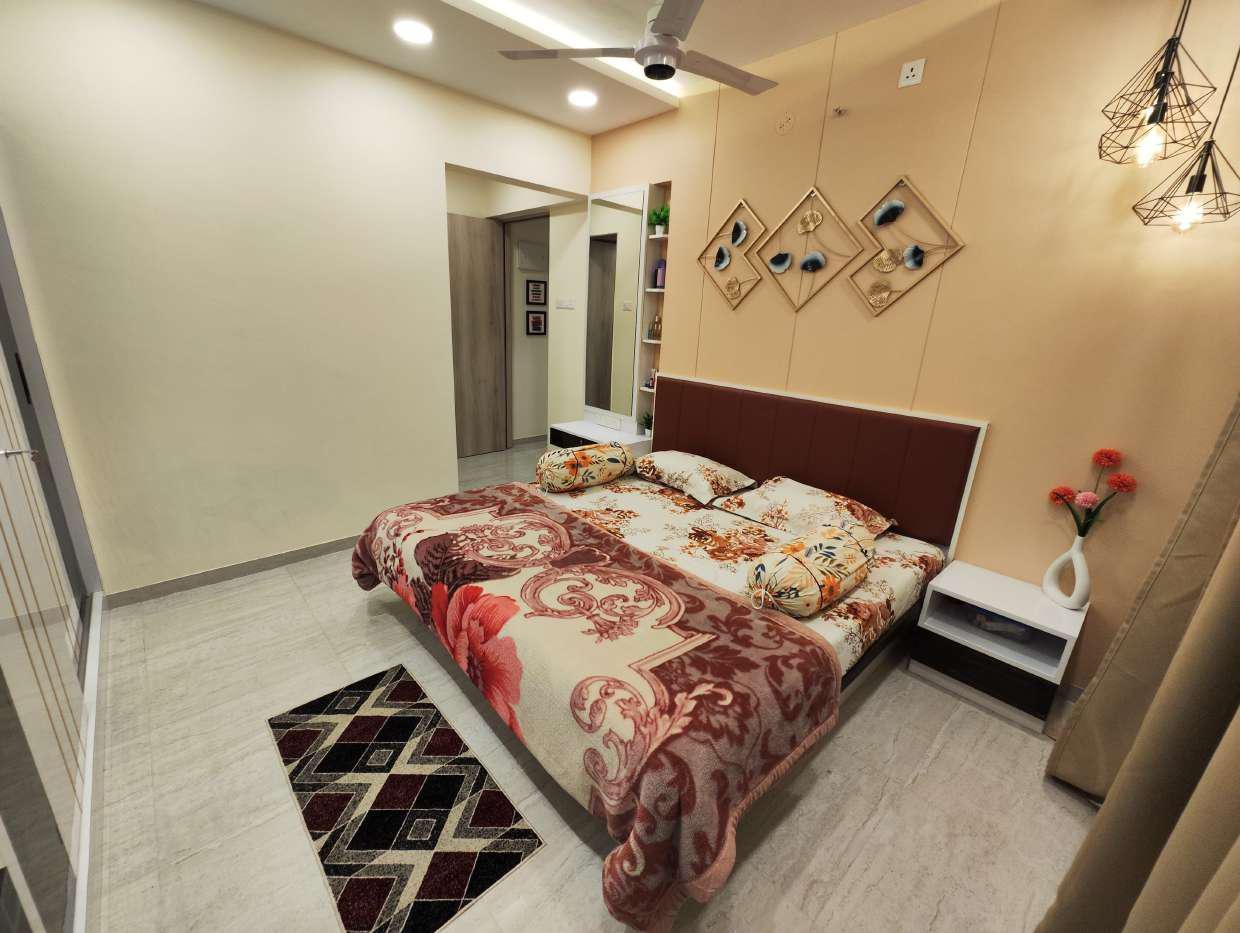 The master bedroom of this 2BHK Interior Design Project in Thane features soothing beige tones, accent lighting, and thoughtful decor. A soft-upholstered headboard complements the wall art, while suspended pendant lights on either side add a modern touch.