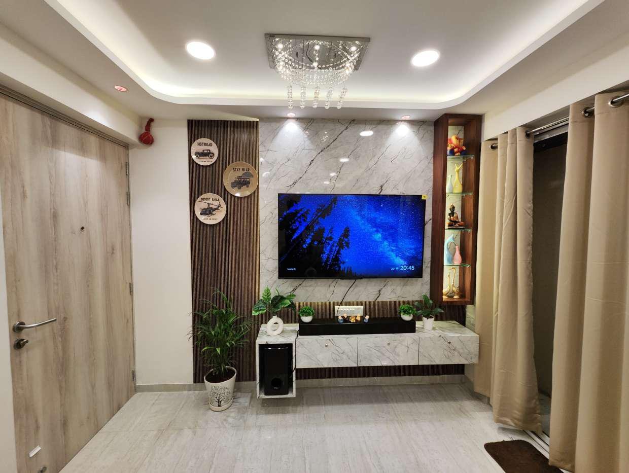 The false ceiling design integrates recessed lighting and a central fan, offering a modern yet cozy vibe. On the TV wall, we used a marble-textured laminate paired with fluted wooden panels and subtle backlighting. A sleek floating TV unit keeps the area clutter-free while adding a luxurious visual appeal.