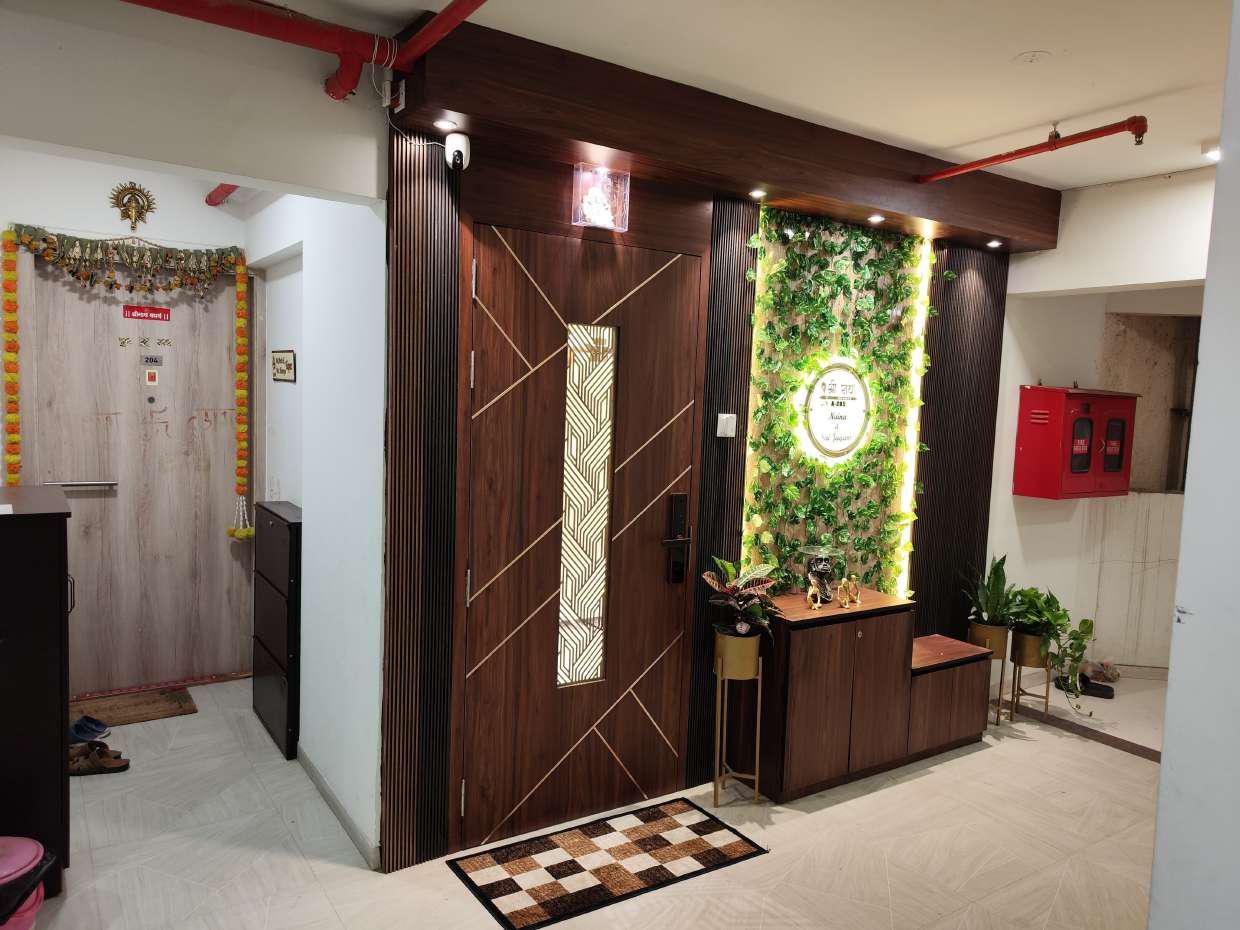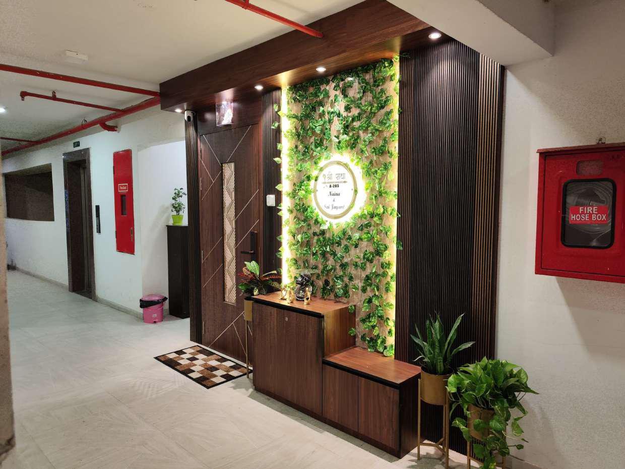 The first impression of any home begins at the entrance. For this 2BHK home in Thane, we designed a stunning foyer wall featuring a vertical garden panel with warm lighting and natural wooden tones. The green accents instantly add freshness, while the custom wall nameplate gives a personalized touch.